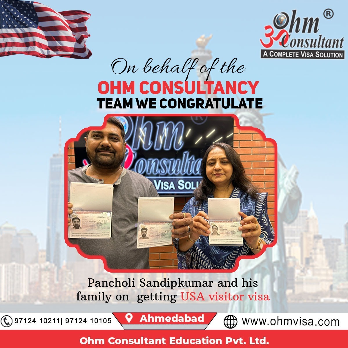 ๐โ๏ธ Another Successful USA Visitor Visa Approval! Heartiest congratulations to Pancholi Sandipkumar and his family on receiving their USA Visitor Visa. ๐บ๐ธ At Ohm Consultant, we are committed to guiding our clients with accurate documentation, expert visa counseling, and a transparent process to achieve successful visa outcomes. With 20+ years of experience in visa consultancy, our team continues to help families turn their international travel dreams into reality. If you are planning to apply for a USA Visitor Visa, Student Visa, or Immigration, our experienced team is here to assist you at every step. ๐ Ahmedabad ๐ 97124 10211 | 97124 10105 ๐ www.ohmvisa.com Ohm Consultant โ A Complete Visa Solution