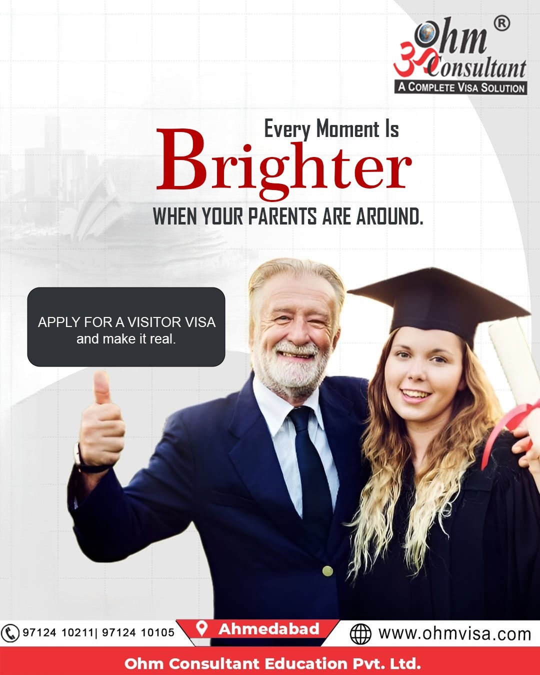 Every Moment Feels Brighter When Parents Are By Your Side. Bring your parents closer for life’s most meaningful milestones. Apply for a Visitor Visa with Confidence — and Make It Happen. With expert guidance and a proven process, Ohm Consultant helps families reunite across borders smoothly and stress-free. 📍 Ahmedabad 🌐 www.ohmvisa.com 📞 97124 10211 | 97124 10105