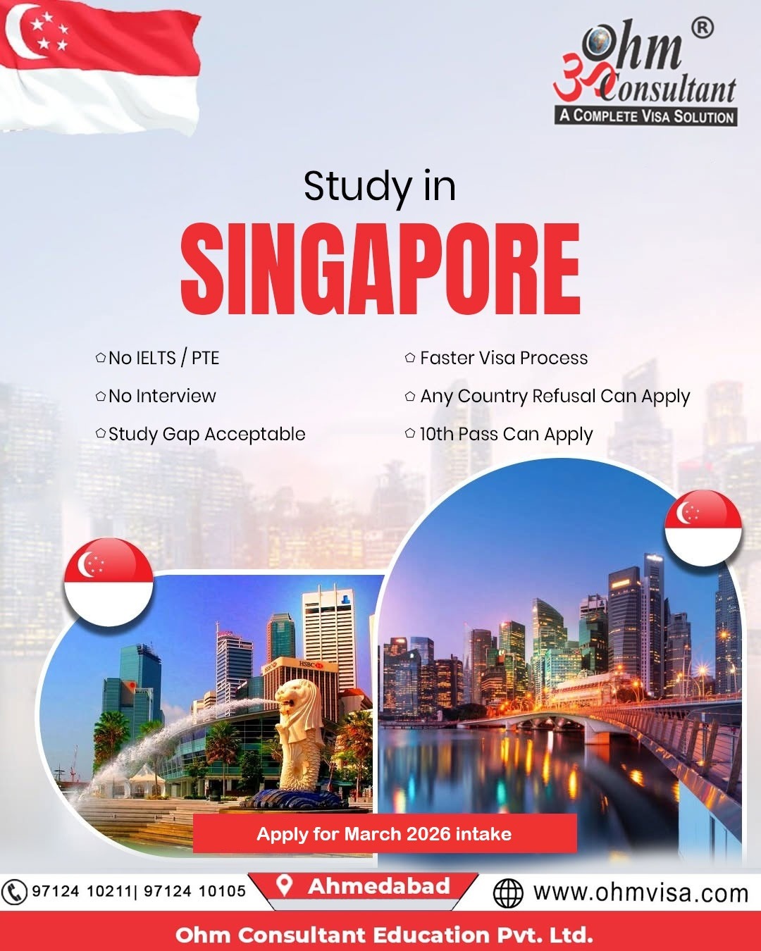 Study in Singapore. No IELTS - PTE. No Interview. Study gap acceptable. Faster visa process. Any country refusal can apply. SSC pass can apply. Apply for March 2026 intake.