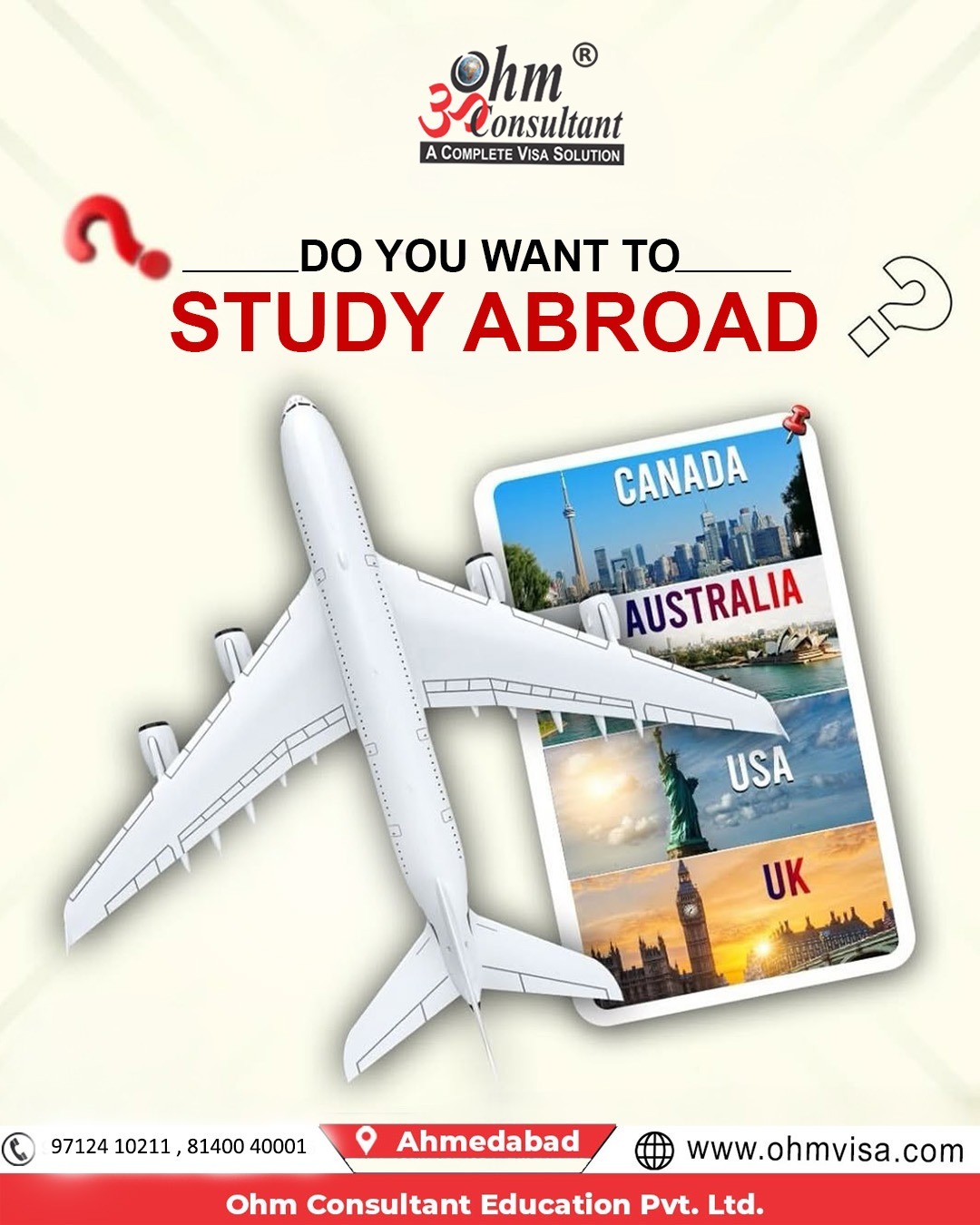 π Turn Your Dream of Studying Abroad into Reality! βοΈ Explore world-class education opportunities in top destinations like Canada, Australia, USA, and the UK with expert guidance at every step. At Ohm Consultant Education Pvt. Ltd., we provide complete support β from university selection and application processing to visa assistance β ensuring a smooth and successful journey abroad. π Based in Ahmedabad π Contact: 97124 10211 | 81400 40001 π Visit: www.ohmvisa.com Start your global education journey today with trusted experts!