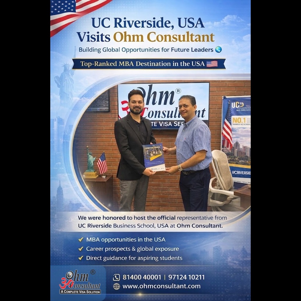 We were honored to welcome the official representative from University of California, Riverside Business School at Ohm Consultant. This valuable interaction provided aspiring students with exclusive insights into top-ranked MBA opportunities in the USA, along with guidance on global career prospects and academic pathways. At Ohm Consultant, we remain committed to connecting students with world-class universities and empowering them to achieve their international education goals. 🌍🎓 📞 Connect with us today to start your journey toward global success