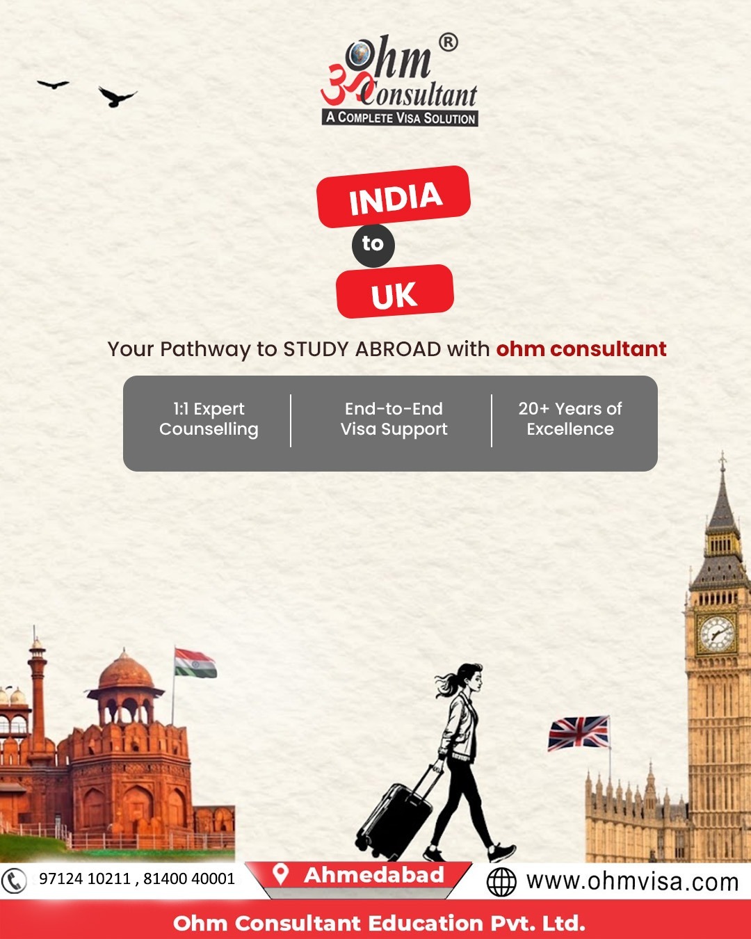Your Gateway from India to the UK Turn your dream of studying in the UK into reality with Ohm Consultant – your trusted partner for global education. We provide a seamless and guided journey to help you achieve your academic goals with confidence. Why Choose Us? ✔ Personalized 1:1 Expert Counselling ✔ Complete End-to-End Visa Assistance ✔ 20+ Years of Proven Excellence Begin your international education journey with reliable support and expert guidance every step of the way. Apply Today and Take the First Step Towards a Global Future! 📍 Ahmedabad 📞 97124 10211 | 81400 40001 🌐 www.ohmvisa.com