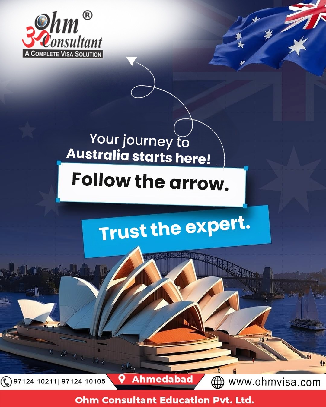 Your journey to Australia starts here! Follow the right direction. Trust the expert. Ohm Consultant – A Complete Visa Solution. From application to approval, we guide you at every step. 📍 Ahmedabad 📞 97124 10211 | 97124 10105 🌐 www.ohmvisa.com
